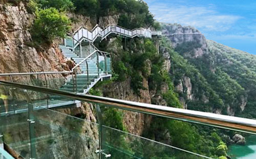 特别是针对众多行人在桥上齐步走时容易引发共振,导致大桥结构变形的技术问题,在总长430米、宽6米的玻璃桥上共不规则地放置着72个重达750公斤的玻璃球,客观上就打乱了众多行人齐步通行的步伐,有效遏制了人行振动。同时,对于桥面玻璃的选材,几乎对全球有一定影响力的玻璃制造企业进行了全部筛选,并反复进行了载重碾压试验,目前的桥面玻璃具备了“大尺寸、高硬度、高厚度、耐磨、防冻、超纯净、防爆、高荷载、防霉、防温度剧降等诸多特性。按照设计,桥面最大游客容量为800人,游客无需担心桥面玻璃的受压问题,可谓“固若金汤”。此外,玻璃桥开放后,还将建立健康监测系统,确保桥梁的耐久性。