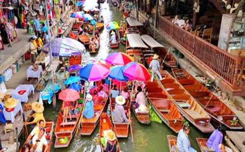 泰国水上市场,河道就是街道马路,汽艇和大小木船代替了各种大小车辆;头戴斗笠的农妇划着轻盈的小船,城市的商贾开着汽艇从四面八方赶到这里,船上满载着丰富的农产品、工艺品等,卖主在船上展出各种商品叫卖,买主也划着船前往选购所需的商品,买卖的船只,划划停停,不受限制,讨价还价声,此起彼落的叫卖声,汽艇的马达声组成一曲奇妙的水上交响曲。商贩、顾客、游客云集于水上市场,非常热闹。