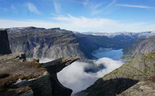 这块石头最惊险的地方就是周围没有任何保护,而且下面峡湾的蒸汽和云雾经常弥漫到石头上面,所以有时候根本就看不到下面的情况。如果天气晴朗,能看到下面反而更令人眩晕,石头对面就是一个瀑布,下面的风绝对能把人吹的摇摇欲坠。