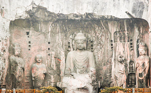 龙门石窟始开凿于北魏孝文帝迁都洛阳(公元493年)前后,后来,历经东西魏、北齐、北周,到隋唐至宋等朝代又连续大规模营造达400余年之久。密布于伊水东西两山的峭壁上,南北长达1公里,共有97000余尊佛像,最大的佛像高达17.14米,最小的仅有2厘米。西山崖壁上有北朝和隋唐时期的大、中型洞窟50多个。古阳洞、宾阳中洞、莲花洞、皇甫公窟、魏字洞、普泰洞、火烧洞、慈香窑、路洞等,为北魏时期的代表洞窟;潜溪寺、宾阳南洞、宾阳北洞(以上两洞的洞窟及窟顶装饰完成于北魏,佛像完成于隋和初唐)、敬善寺、摩崖三佛龛、万佛洞、惠简洞、奉先寺、净土堂、龙花寺、极南洞等为唐代代表洞窟。东山全是唐代的窟龛,其中大、中型洞窟有20个,如二莲花洞、看经寺洞、大万伍佛洞(又名擂鼓台三洞)、高平郡王洞等。