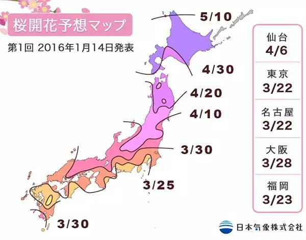 本次预报包括了从北海道到鹿儿岛共1000处赏樱名胜的染井吉野樱的开花日以及满开日(樱花种类繁多,每个种类的开花日都稍有不同,因此樱花预报大多用棵数最多的染井吉野樱进行预测)。总体来说,今年日本北部与东部的开花将比常年稍早;西部地区与往年相同;九州南部地区则比往年要晚。