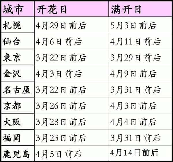 每年3月15日至4月15日左右是日本自南至北樱花开放的季节,由于樱花自开花至花残只有七天,所以也有樱花七日的说法,而日本全岛樱花开放至衰败的整个过程就被称为——樱花祭。每到这一时节,人们在樱花树下或合家欢聚一堂,或邀请三五好友,边欣赏风景边谈笑风生。三四月各位若打算去日本赏樱的话,可千万要好好看下并分享收藏下这份攻略!今年的开花日大概在 3月22日到4月29日左右。(旅游传送门:关于春季出去踏青赏花哪里好可以咨询重庆中国青年旅行社(400-023525)或者访问重庆中国青年旅行社官网:http://www.cqtrvl.com/)