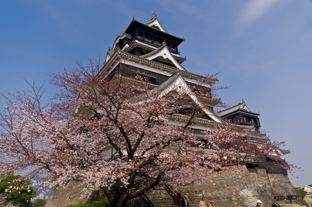 熊本城是由加藤清正于17世纪初修建而成的,是日本三大名城之一。该城四周是被称作“武士返回”的著名石墙,除此之外象黑白色调对比鲜明的天守阁、长墙等,值得一看的地方数不胜数。尤其是约800株的樱花树更为熊本城增添了几分幽雅与隽美。以染井吉野樱为主,种植有山樱、肥后樱等,而天守阁前的广场和长墙前是观赏樱花的最佳场所。另外在城郭一带的开阔地还建有县立美术馆、市立博物馆、监物台树木园以及传统工艺馆等,也可谓是一座文化城市。