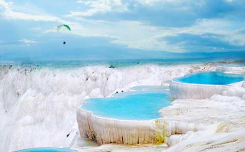 棉花堡位于土耳其的西南部山区,但它并不是一座真正意义上的城堡,而是一座白色的山坡,但远看就像是棉花团一样,十分的可爱。白色的岩石搭配这蓝色的海水,让它更显纯洁。棉花堡是远近闻名的温泉度假胜地,棉花堡最早由罗马人发现,当时的达官贵人与财阀富豪,都以到这里来泡温泉安享晚年为荣。对于古代人而言,如此美丽的景色一定是神所生活的地方。一边泡着流淌了两千多年的纯白温泉,一边欣赏着不远处辉煌的遗迹,这种特殊的感受,唯有来到土耳其才能体验得到。