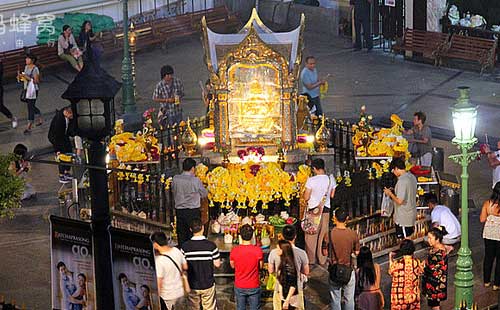 泰国曼谷四面佛坛是泰国香火最鼎盛的宗教据点之一,在曼谷市中心爱侣湾的Ratchadamri路和Phloen Chit路交界,邻近君悦酒店和崇光百货。在此地设立四面佛坛的原因,据说是在1956年Erawan酒店(君悦酒店前身)兴建之时,发生了一连串的不幸事故,业主请来了在泰国据说有天眼通的銮素威参佩少将察看并依其建议供奉四面佛,于是乃平安顺利。