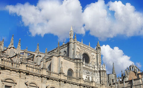 塞维利亚大教堂所在地原为塞维利亚大清真寺,15世纪清真寺被拆毁,在原址上建造塞维利亚大教堂。它曾是基督教世界里最大的宗教建筑,与梵蒂冈圣彼得大教堂、伦敦圣保罗大教堂并称为世界三大教堂,已经被选为世界文化遗产。
