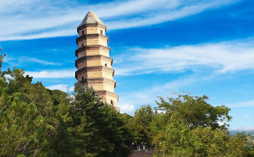 宝塔山,古称丰林山,宋时改名为嘉岭山。现在人们又称宝塔山。位于延安城东南方,海拔1135.5米,为周围群山之冠。宝塔山上视野开阔,林木茂盛,山林空气清新,凉爽宜人,夏季平均气温较内低3-4摄氏度,是消夏避暑的好地方。宝塔建于唐代,高44米,共九层,登上塔顶,全城风貌可尽收眼底。它是历史名城延安的标志,是革命圣地的象征。在塔旁边有一口明代铸造的铁钟,中共中央在延安时,曾用它来报时和报警。此外山上还有长达260米的摩崖石刻群和碑林,石刻岸面整齐,岸石完整,是难得的石刻艺术。山上现已建成为宝塔山公园,林木葱郁,环境优美。宝塔山是延安市的标志性建筑,是游览延安的必去之地。看完延安宝塔山简介,接下来和重庆旅行社一起来了解下宝塔山主要景点、宝塔山门票、宝塔山开放时间及宝塔山交通。 宝塔山主要景点