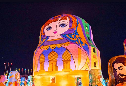 我来的还算及时,能看到俄罗斯套娃广场的夜景,在大街上要闲逛到十一点半时,眼前仙境般的城市才会在突然消失,因为这时全城所有效果灯光会统一关闭。如果九月末天气转冷才到满洲里,灯光会提前到十点关闭。因为这时已没有外地游客,多开一个小时灯浪费电。而俄罗斯套娃广场则会整个关闭。
