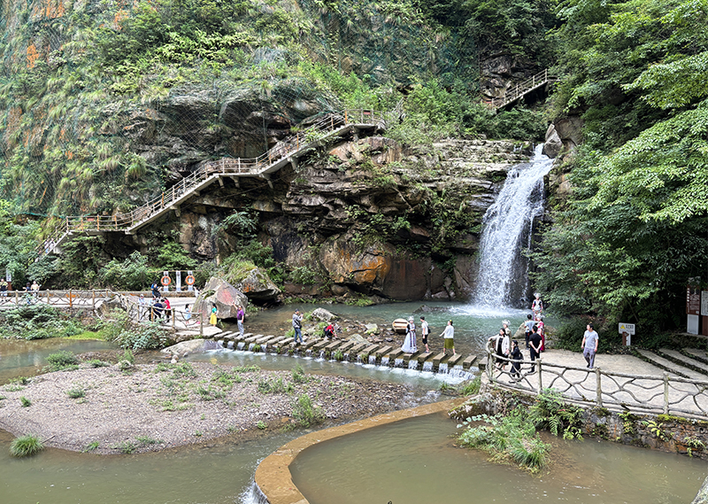 景区地处北纬30°线上,平均海拔1500米,冬季温度15-零下5°,夏季温度20-28°,全长5.8公里、总落差260米、长达1.5小时的闯滩亲水漂流,3D绝壁玻璃栈道,网红悬崖秋千、步步惊心等娱乐体验项目已成为时下的热门项目。