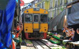 美功铁道市场被称为最牛菜市场,是泰国的神奇一景。近年来由于游客越来越多,成为了到必去的泰国旅游景点之一。这里每天都有八趟火车穿过市场,只见火车贴着菜摊,十分惊险。